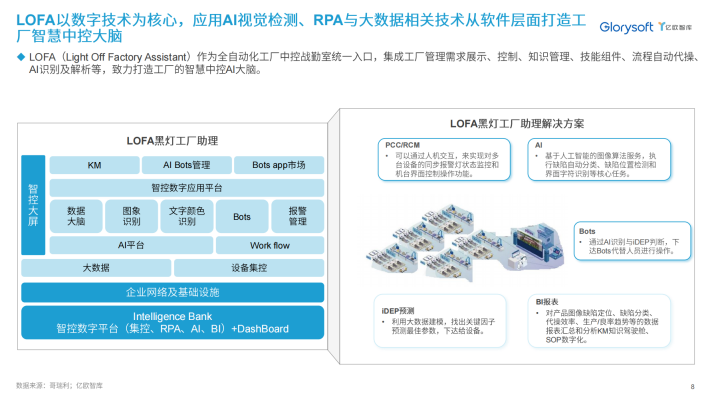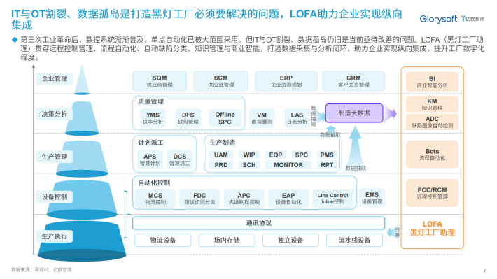 第三次工业革命后,数控系统渐渐普及,单点自动化已被大范围采用。但IT与OT割裂、数据孤岛仍旧是当前亟待改善的问题。LOFA(黑灯工厂助理)贯穿远程控制管理、流程自动化、自动缺陷分类、知识管理与商业智能,打通数据采集与分析闭环,助力企业实现纵向集成,提升工厂数字化程度。