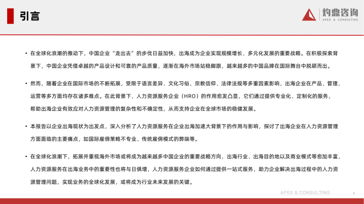 本报告以企业出海现状为出发点,深入分析了人力资源服务在企业出海加速大背景下的作用与影响,探讨了出海企业在人力资源管理方面面临的主要痛点,如国际雇佣策略不专业、传统雇佣模式的弊端等。