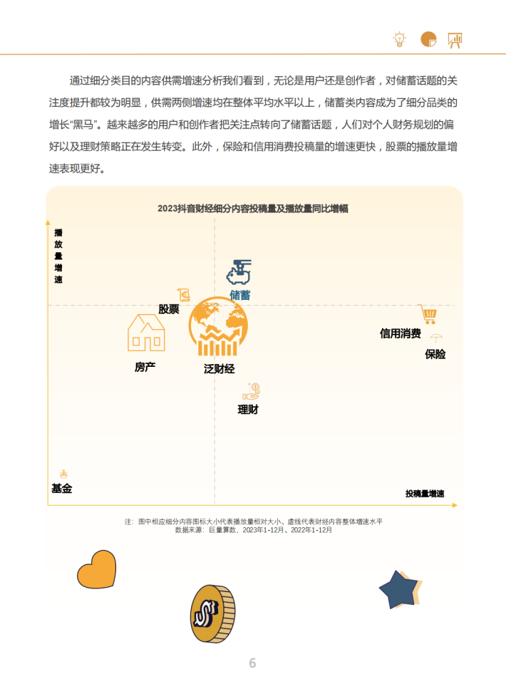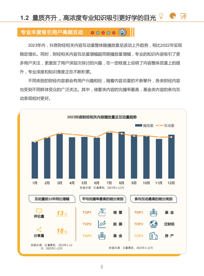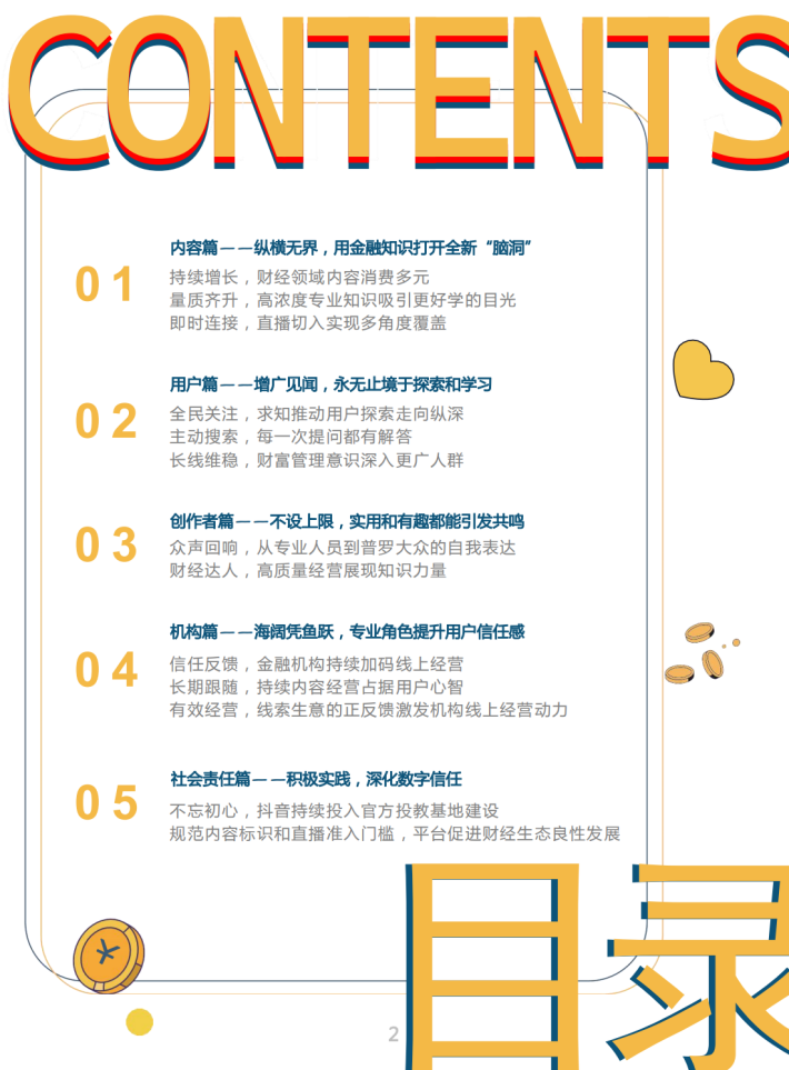 过去一年,抖音与2亿名财经用户、4千万名创作者、2万家机构携手同行,共同成长。为用户呈现更丰富、更专业的财经信息和知识内容;为创作者打造展示舞台,让有识之士通过持续的内容创作进而产生影响;也帮助机构在平台上与更多用户建立连接,从而获取更多生意机会。通过超7亿支相关视频内容、超200万场财经达人直播,共同构建起丰富、活跃、健康的财经内容生态。