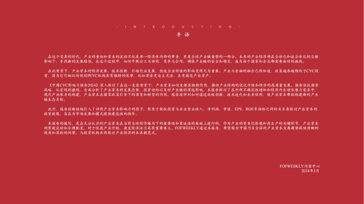 本报告的编写,是在充分认识到产业资本在当前全球经济格局下的重要性和紧迫性的基础上进行的。作为产业的资本化体现和再生产的关键环节,产业资本的有效流动和合理配置,对于促进产业升级、激发经济活力具有重要意义。FOFWEEKLY通过本报告,希望能为中国乃至全球的产业资本发展趋势提供清晰的视角和深刻的洞察,与投资机构共同探讨产业经济的未来新范式。