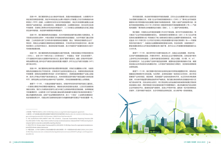 回首十年,我们见证供应链需开展环境管理的认知逐步成为主流:从2014年第一期评价时仅有37%的企业主动承诺绿色采购,到今天评价范围大幅扩展的条件下,高达73%的企业通过供应商守则或年度报告,披露供应链环境与气候风险管控要求¹;我们见证了龙头企业借助公开的监管信息,推动大批供应商企业做出改善:从首期参评企业推动500余家供应商作出回应,到今天累计推动2.5万余家供应商交流、整改或披露。