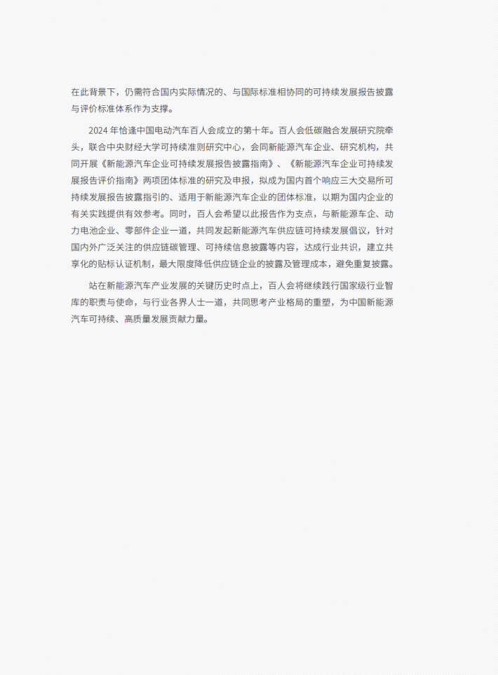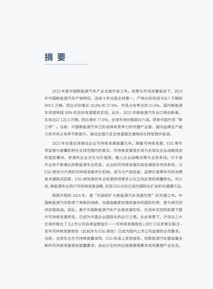 刚刚开局的2024年,是“巩固和扩大新能源汽车发展优势”的关键之年。中国新能源汽车取得了亮眼的成绩,也面临着更加错综复杂的国际形势、更为艰巨的供应链挑战。因此,基于中国新能源汽车产业链发展实际,在成本可控的前提下提升可持续发展表现,已成为中国企业国际化的必行之策。在此背景下,沪深北三大交易所推出了《上市公司自律监管指引——可持续发展报告(试行)(征求意见稿)》,发布可持续发展报告(此前多为ESG报告)已成为国内上市公司监管的必然要求。当前,全球车企在可持续披露准则、ESG标准上逐渐接轨,但新能源汽车面临着全新的可持续发展报告披露要求,由此衍生的供应链碳管理要求或将重塑产业生态。