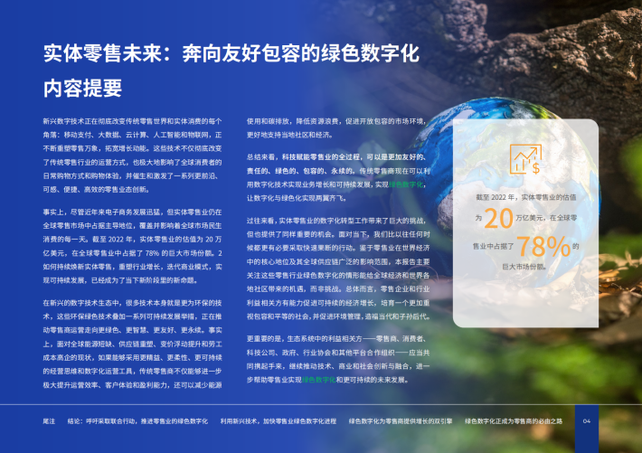 事实上,尽管近年来电子商务发展迅猛,但实体零售业仍在全球零售市场中占据主导地位,覆盖并影响着全球市场民生消费的每一天。截至2022年,实体零售业的估值为20万亿美元,在全球零售业中占据了78%的巨大市场份额。2如何持续焕新实体零售,重塑行业增长,迭代商业模式,实现可持续发展,已经成为了当下新阶段里的新命题。