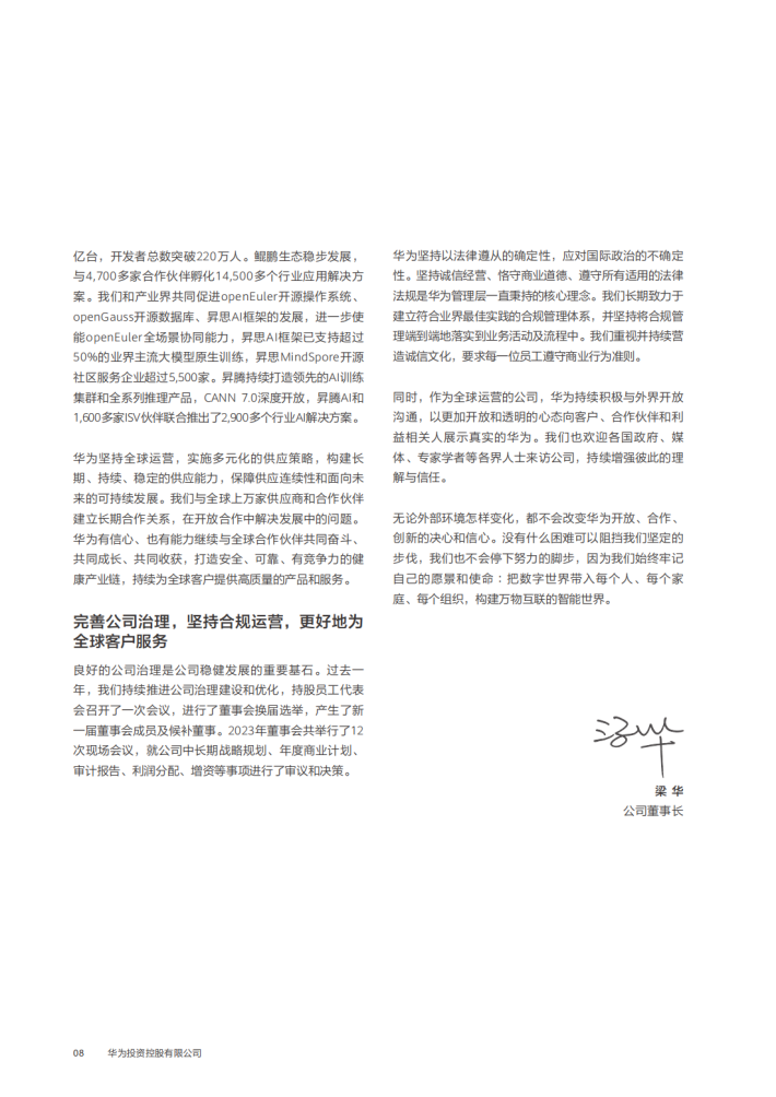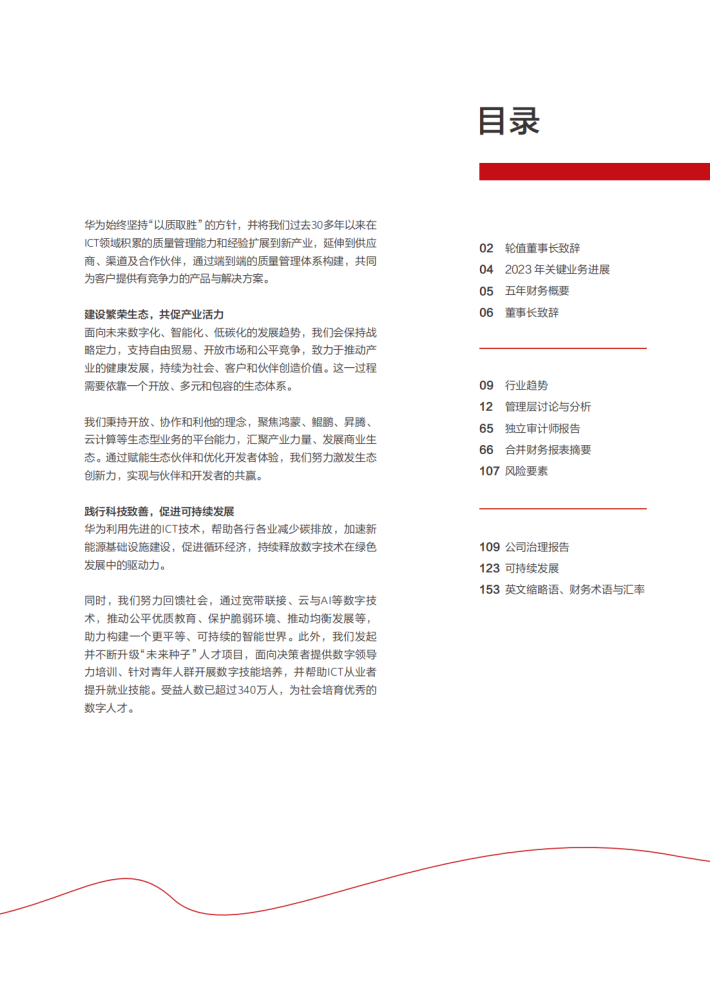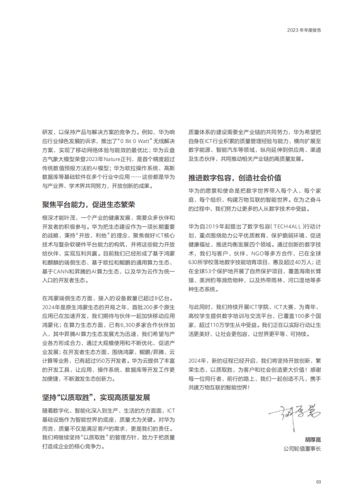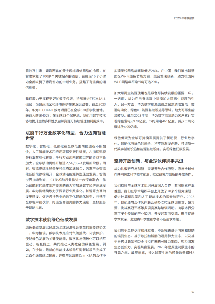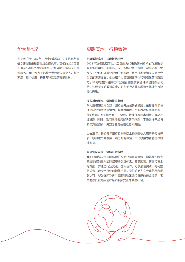 面向数字化、智能化、低碳化趋势,2023年,华为提出全面智能化(All Intelligence)战略,使能百模千态,赋能千行万业,加速行业智能化转型。鲲鹏、异腾生态稳步发展,已有超过570万开发者、超过6,300家合作伙伴,完成超过17,400个解决方案认证。同时,华为发布了行业智能化参考架构、系列行业智能化解决方案和《加速行业智能化》白皮书等,希望为千行万业数智化转型的实施和落地提供具体的帮助和参考。