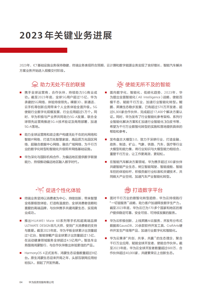 携手全球运营商、合作伙伴,持续助力5G商业成功。截至2023年底,全球5G用户超过15亿,华为承建的5G网络,体验持续领先。裸眼3D、新通话、云手机等创新应用带来个人业务体验全面升级。5G使能行业数字化规模发展,行业应用超过5万个。同时,华为积极与产业界共同助力5G-A发展,联合全球领先运营商推进5G-A技术验证及商用部署,加速5G-A落地。