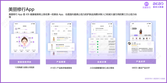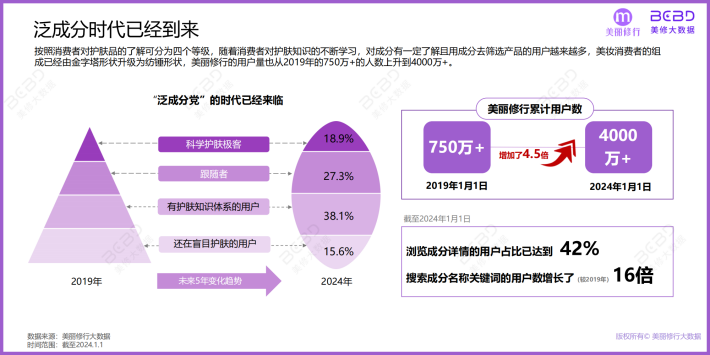 按照消费者对护肤品的了解可分为四个等级,随着消费者对护肤知识的不断学习,对成分有一定了解且用成分去筛选产品的用户越来越多,美妆消费者的组成已经由金字塔形状升级为纺锤形状,美丽修行的用户量也从2019年的750万+的人数上升到4000万+。