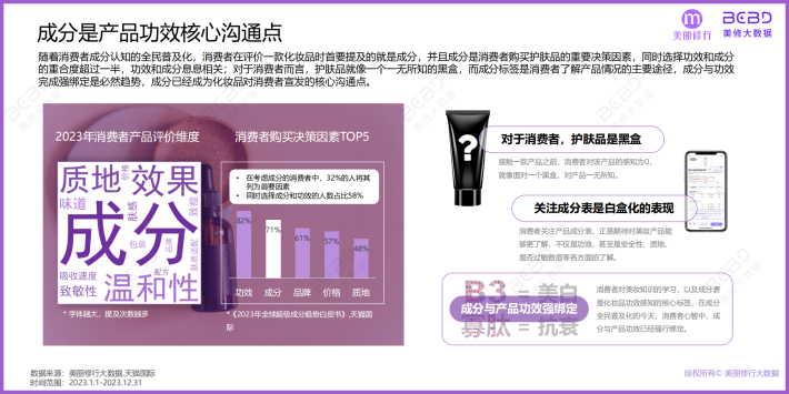 随着消费者成分认知的全民普及化,消费者在评价一款化妆品时首要提及的就是成分,并且成分是消费者购买护肤品的重要决策因素,同时选择功效和成分的重合度超过一半,功效和成分息息相关;对于消费者而言,护肤品就像一个一无所知的黑盒,而成分标签是消费者了解产品情况的主要途径,成分与功效完成强绑定是必然趋势,成分已经成为化妆品对消费者宣发的核心沟通点。