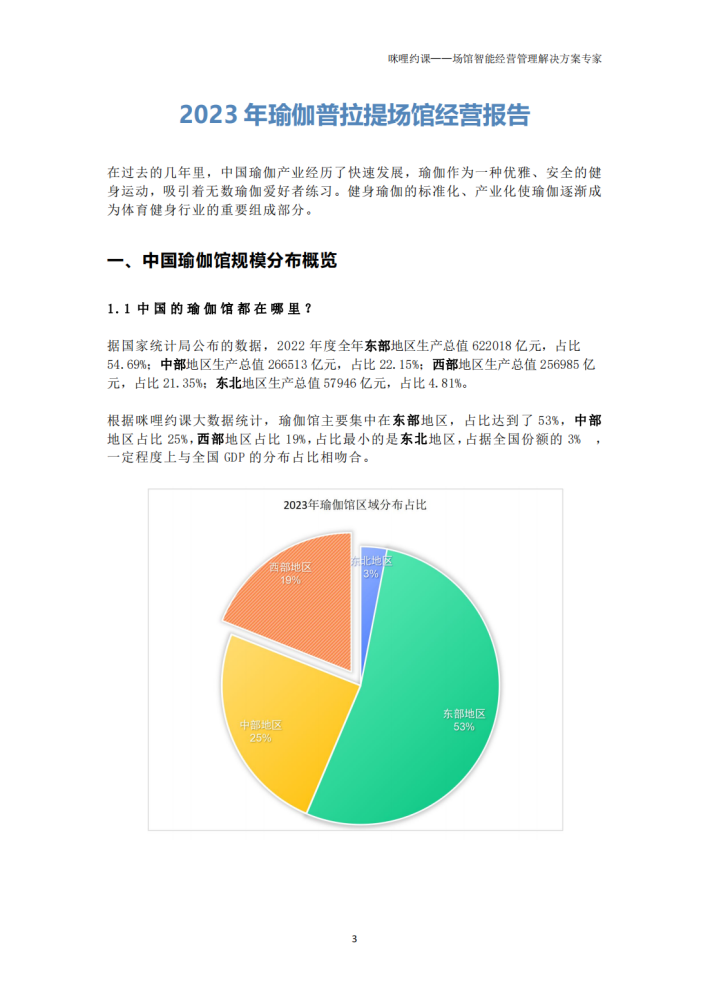 根据咪哩约课大数据统计,瑜伽馆主要集中在东部地区,占比达到了53%,中部地区占比25%,西部地区占比19%,占比最小的是东北地区,占据全国份额的3% ,一定程度上与全国GDP的分布占比相吻合。