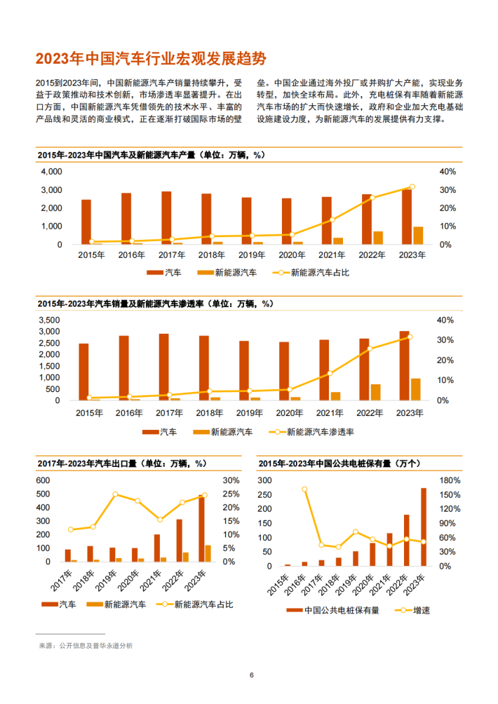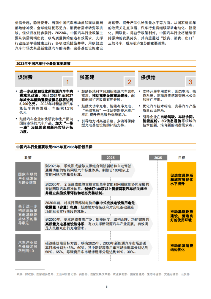 坐看云起,静待花开。当前中国汽车市场虽然面临着局部地缘冲突、全球经济复苏乏力、消费者需求转变等挑战,但依旧在稳步前行。2023年,中国汽车行业政策主要从供需两端出发,以高质量供给创造有效需求,支撑行业经济平稳健康运行;多项政策措施并举,用以促进汽车市场尤其是新能源汽车的消费、完善基础设施建设与运营、提升产品供给质量水平等方面。从国家近些年的政策关注点来看,汽车行业将继续深耕电动化、智能化,网联化。得益于政策利好,中国汽车行业将继续保持强劲的发展势头,并有望通过“投资、消费、出口”三驾马车,成为引济复苏的重要引擎。