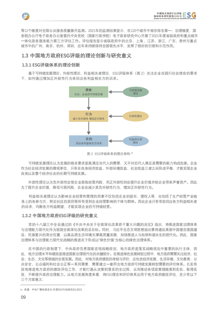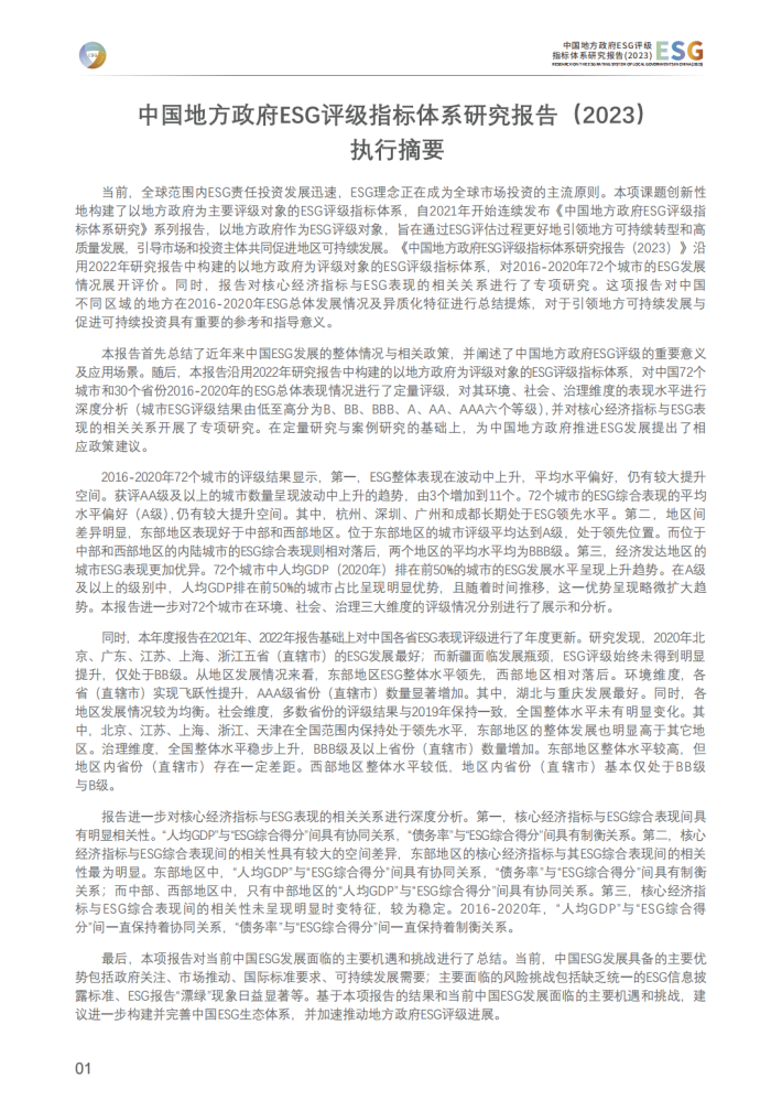 当前,全球范围内ESG责任投资发展迅速,ESG理念正在成为全球市场投资的主流原则。本项课题创新性地构建了以地方政府为主要评级对象的ESG评级指标体系,自2021年开始连续发布《中国地方政府ESG评级指标体系研究》系列报告,以地方政府作为ESG评级对象,旨在通过ESG评估过程更好地引领地方可持续转型和高质量发展,引导市场和投资主体共同促进地区可持续发展。《中国地方政府ESG评级指标体系研究报告(2023)》沿用2022年研究报告中构建的以地方政府为评级对象的ESG评级指标体系,对2016-2020年72个城市的ESG发展情况展开评价。同时,报告对核心经济指标与ESG表现的相关关系进行了专项研究。这项报告对中国不同区域的地方在2016-2020年ESG总体发展情况及异质化特征进行总结提炼,对于引领地方可持续发展与促进可持续投资具有重要的参考和指导意义。