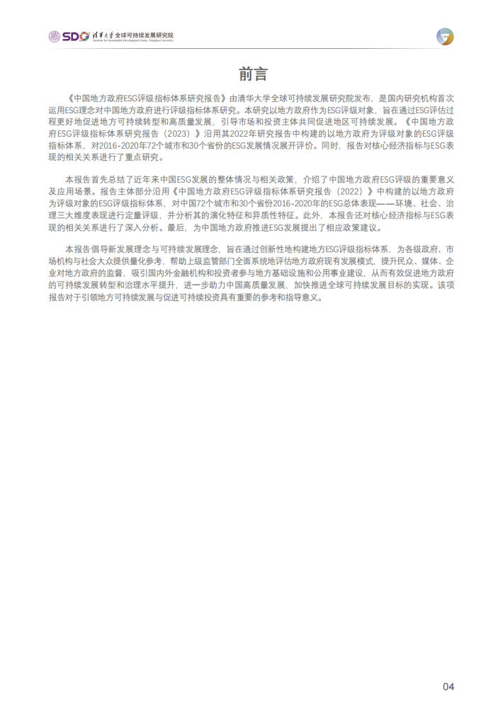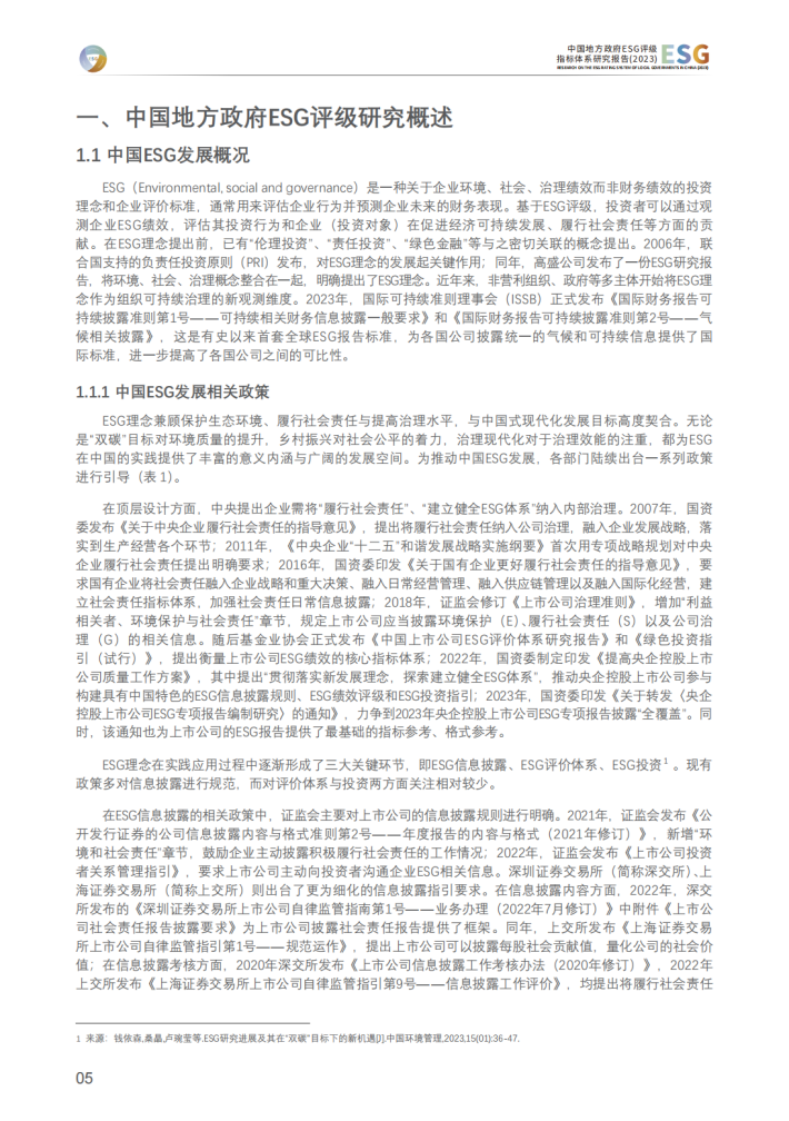 本报告首先总结了近年来中国ESG发展的整体情况与相关政策,并阐述了中国地方政府ESG评级的重要意义及应用场景。随后,本报告沿用2022年研究报告中构建的以地方政府为评级对象的ESG评级指标体系,对中国72个城市和30个省份2016-2020年的ESG总体表现情况进行了定量评级,对其环境、社会、治理维度的表现水平进行深度分析(城市ESG评级结果由低至高分为B、BB、BBB、A、AA、AAA六个等级),并对核心经济指标与ESG表现的相关关系开展了专项研究。在定量研究与案例研究的基础上,为中国地方政府推进ESG发展提出了相应政策建议。