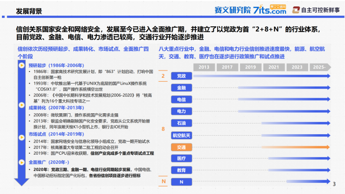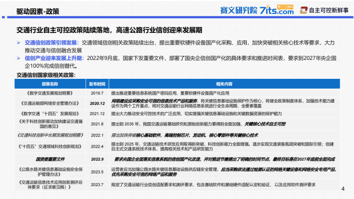 交通信创政策引领发展:交通领域信创相关政策陆续出台,提出重要软硬件设备国产化采购、应用,加快突破相关核心技术等要求,大力推动交通与信创融合发展