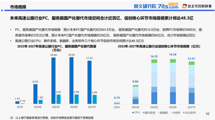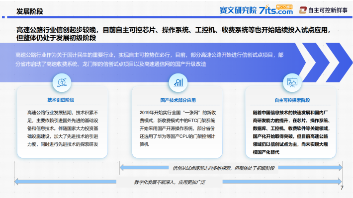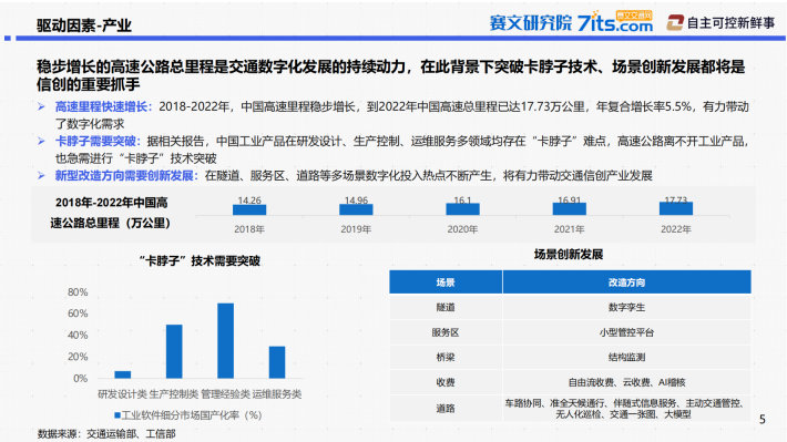 卡脖子需要突破:据相关报告,中国工业产品在研发设计、生产控制、运维服务多领域均存在“卡脖子”难点,高速公路离不开工业产品,也急需进行“卡脖子”技术突破新型改造方向需要创新发展:在隧道、服务区、道路等多场景数字化投入热点不断产生,将有力带动交通信创产业发展