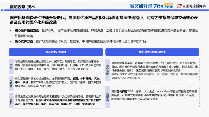 核心硬件设备方面:国产CPU、国产操作系统的服务器、存储系统、工控计算机等设备已经能够替代原有使用进口技术的服务器、存储系统等硬件设备核心软件方面:国产较为成熟操作系统、数据库、中间件和桌面应用软件可以替代进口的同类产品