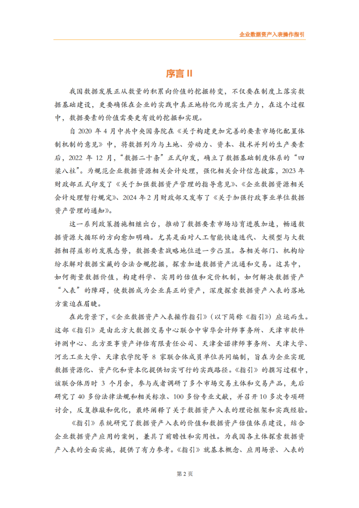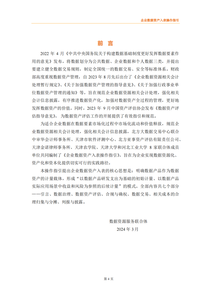 为规范企业数据资源相关会计处理,强化相关会计信息披露,该数据资源服务联合体编制了《企业数据资产入表操作指引》。本操作指引明确了企业数据资产入表的核心思想,详细阐述了数据资产相关概念及应用场景、政策依据及业务需求、基本原则、参与主体、基本路径、数据治理、数据资产评估、合规与确权、数据交易、成本归集与分摊、列报与信息披露等数据资产入表相关内容。本操作指引能够为企业实现数据资源化、资产化和资本化提供切实可行的实践路径,改善企业财务报表结构,提高企业估值及核心竞争力,为投资者提供更多选择与回报。