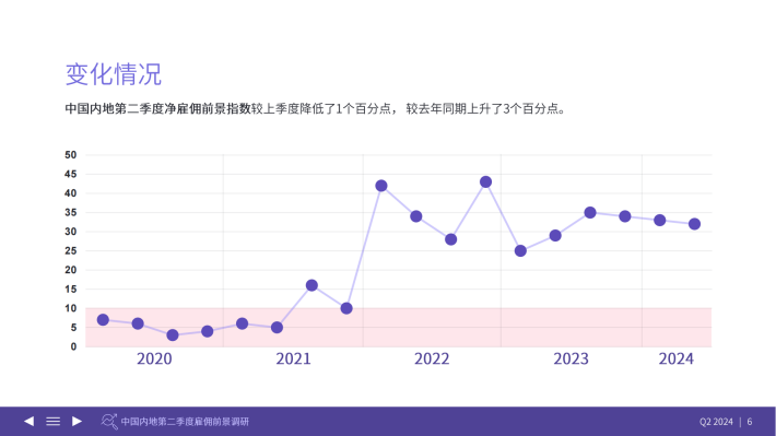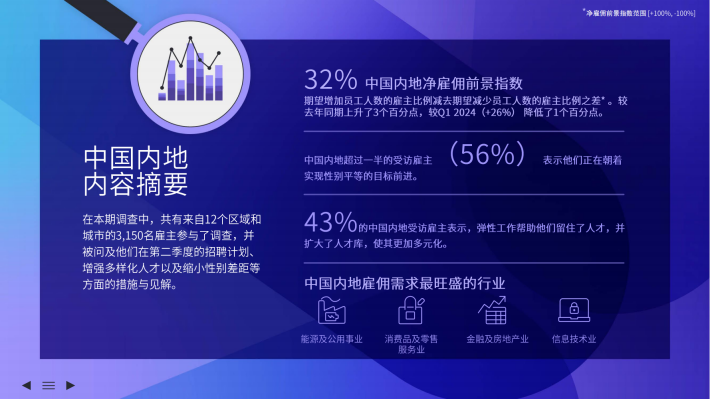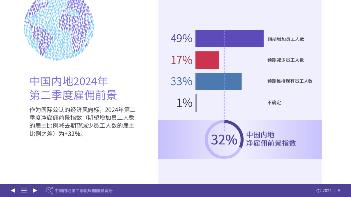 作为国际公认的经济风向标,2024年第二季度净雇佣前景指数(期望增加员工人数的雇主比例减去期望减少员工人数的雇主比例之差)为+32%。