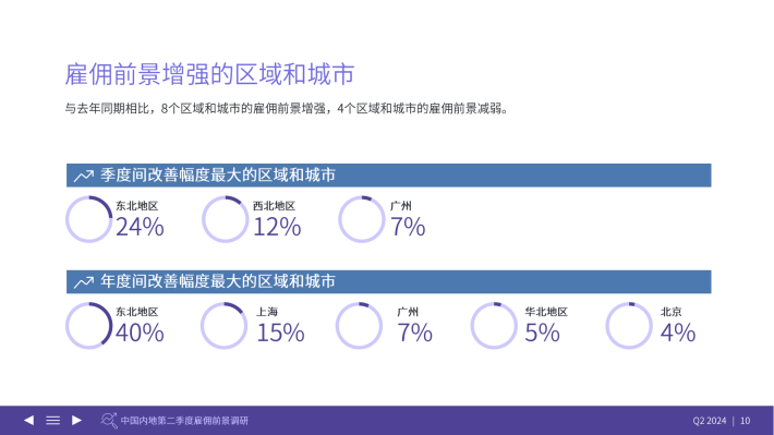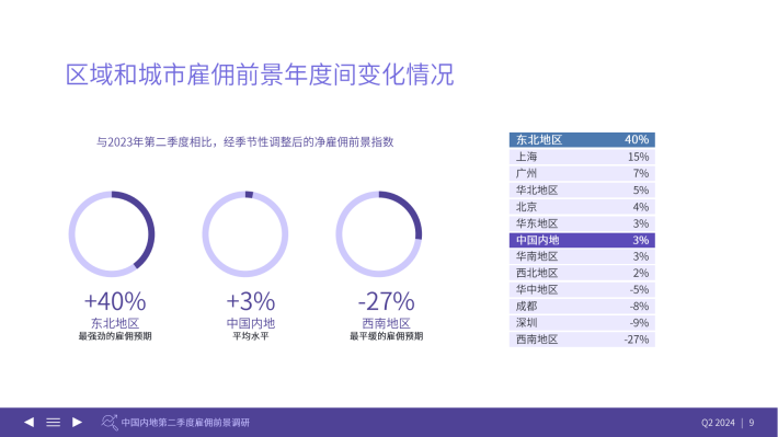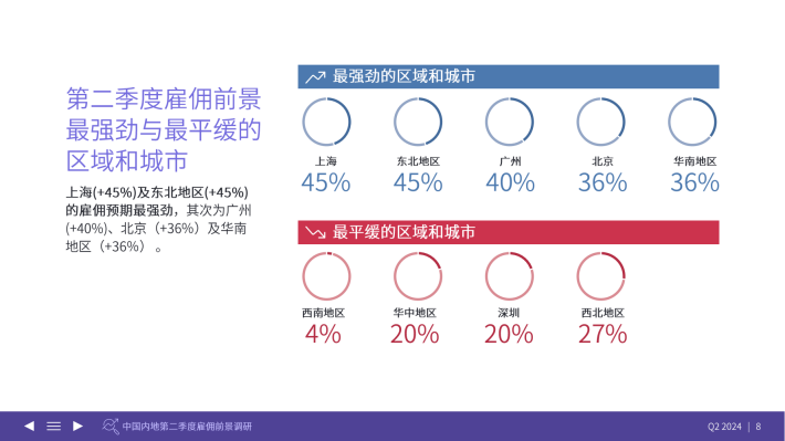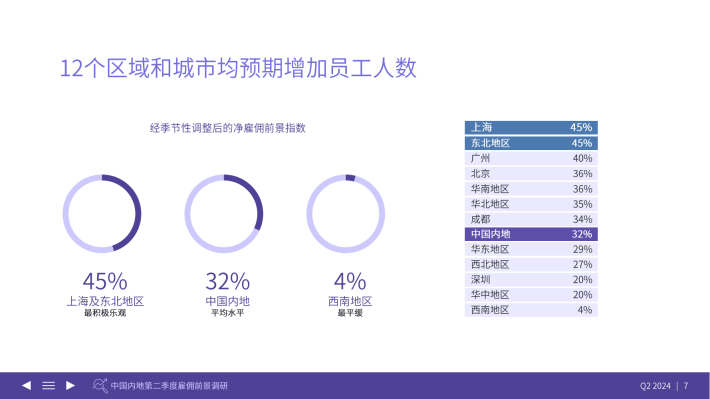 上海(+45%)及东北地区(+45%)的雇佣预期最强劲,其次为广州(+40%)、北京(+36%)及华南地区(+36%)