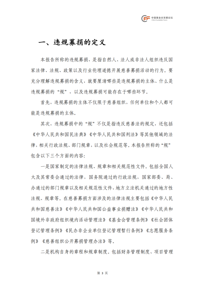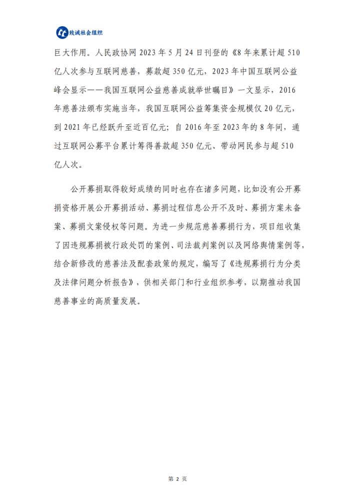 公开募捐取得较好成绩的同时也存在诸多问题,比如没有公开募捐资格开展公开募捐活动、募捐过程信息公开不及时、募捐方案未备案、募捐文案侵权等问题。为进一步规范慈善募捐行为,项目组收集了因违规募捐被行政处罚的案例、司法裁判案例以及网络舆情案例等,结合新修改的慈善法及配套政策的规定,编写了《违规募捐行为分类及法律问题分析报告》,供相关部门和行业组织参考,以期推动我国慈善事业的高质量发展。