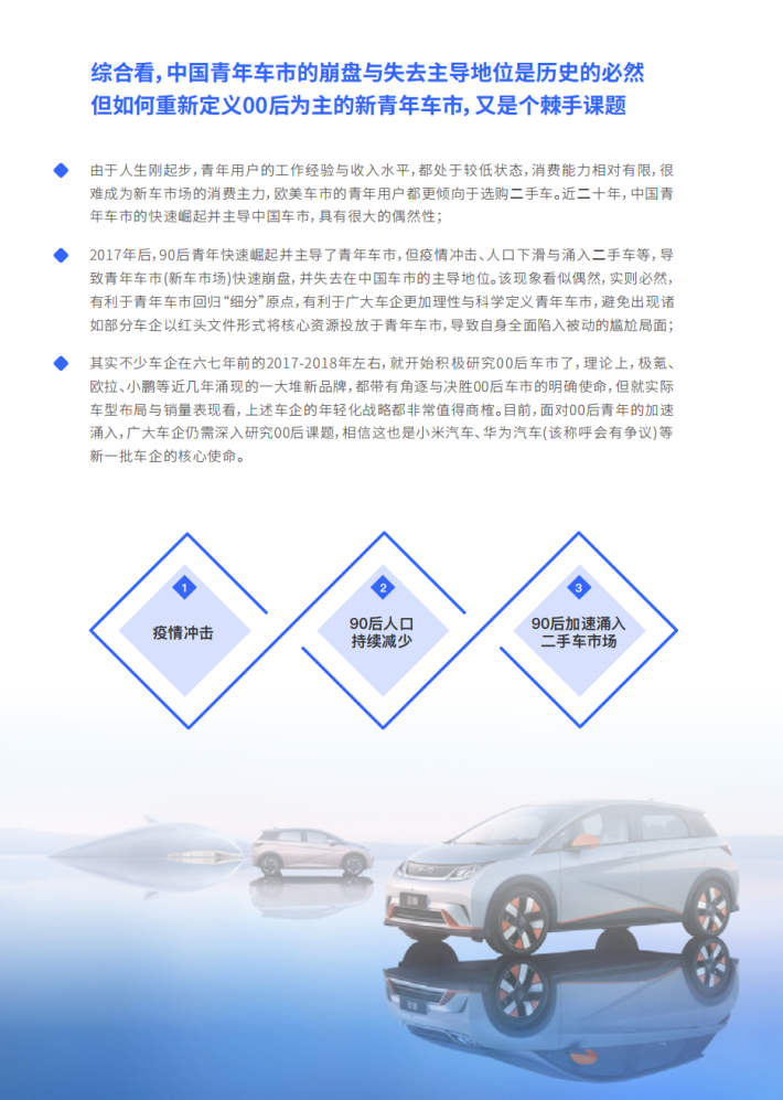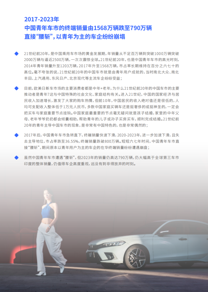 近几年,多数高举年轻化战略的车企的市场表现愈发艰难,越是主流的车企越是如此,该现象让车企非常头痛;不少车型曾经的主力用户都是活蹦乱跳的二三十岁的青年,如今不知不觉就成了拖家带口的四五十岁的中年甚至老年,该现象让车企非常困惑;目前不少车企还没搞清楚如何有效吸引90后青年,但00后青年又嘻嘻哈哈开始大规模涌入中国车市了,该现象让车企非常焦虑……青年车市的一系列变化让车企措手不及,甚至不知所措,急需深入探究与深刻反思青年车市发生了哪些变化、未来怎么演变、如何应对等系列课题;
