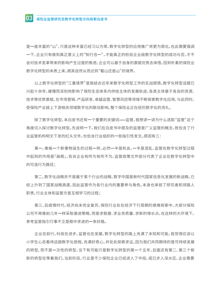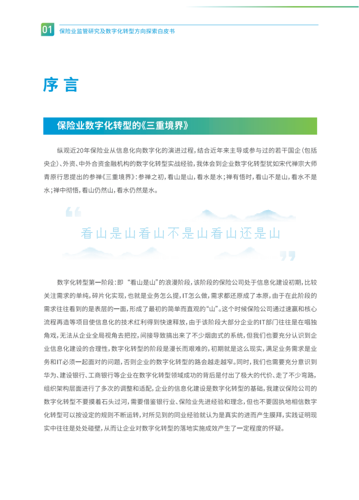 纵观近20年保险业从信息化向数字化的演进过程,结合近年来主导或参与过的若干国企(包括央企)、外资、中外合资金融机构的数字化转型实战经验,我体会到企业数字化转型犹如宋代禅宗大师青原行思提出的参禅《三重境界》:参禅之初,看山是山,看水是水;禅有悟时,看山不是山,看水不是水;禅中彻悟,看山仍然山,看水仍然是水。