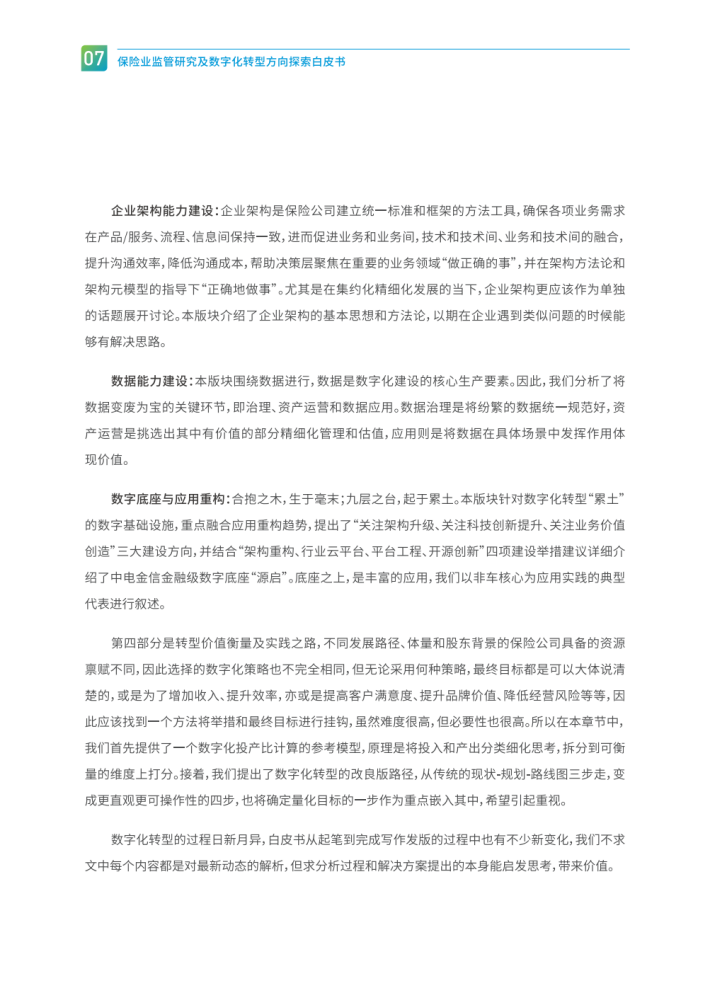 数字化转型第一阶段:即“看山是山”的浪漫阶段,该阶段的保险公司处于信息化建设初期,比较关注需求的单纯,碎片化实现,也就是业务怎么提,IT怎么做,需求都还原成了本原,由于在此阶段的需求往往看到的是表层的一面,形成了最初的简单而直观的“山”。这个时候保险公司通过速赢和核心流程再造等项目使信息化的技术红利得到快速释放,由于该阶段大部分企业的IT部门往往是在唱独角戏,无法从企业全局视角去把控,间接导致搞出来了不少烟囱式的系统,但我们也要充分认识到企业信息化建设的合理性,数字化转型的阶段是漫长而艰难的,初期就是这么现实,满足业务需求是业务和IT必须一起面对的问题,否则企业的数字化转型的路会越走越窄。同时,我们也需要充分意识到华为、建设银行、工商银行等企业在数字化转型领域成功的背后是付出了极大的代价、走了不少弯路,组织架构层面进行了多次的调整和适配,企业的信息化建设是数字化转型的基础,我建议保险公司的数字化转型不要摸着石头过河,需要借鉴银行业、保险业先进经验和理念,但也不要固执地相信数字化转型可以按设定的规则不断运转,对所见到的同业经验就认为是真实的进而产生膜拜,实践证明现实中往往是处处碰壁,从而让企业对数字化转型的落地实施成效产生了一定程度的怀疑。