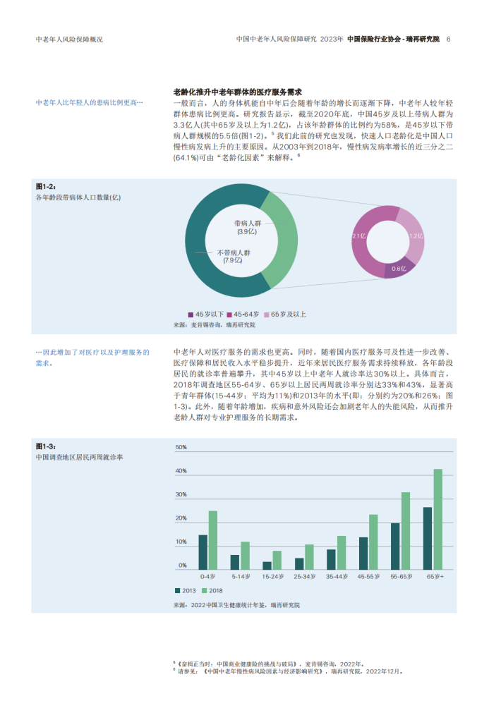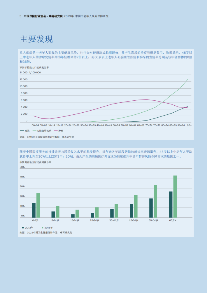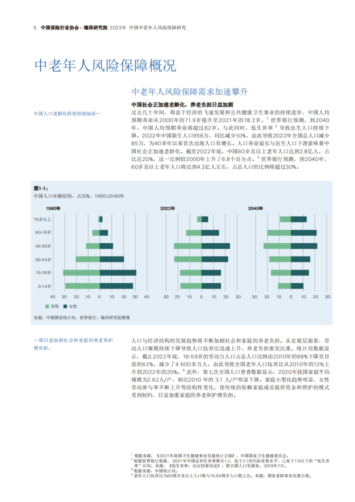 中国居民人均寿命持续上升,而出生人口加速下滑,家庭结构趋于小型化,意味着未来家庭面临着严峻的养老挑战,包括健康、身故、护理、意外等人身风险以及长期储蓄与投资风险。其中,重大疾病是威胁中老年人健康的主要风险。数据显示,45岁以上中老年人的肿瘤发病率约为年轻群体的2.2倍;而60岁以上老年人心脑血管疾病和痴呆的发病率分别是15-59岁群体的8倍和35倍。医疗技术进步、医疗服务可及性的改善,使居民就医需求持续释放,医疗费用加速增长。此外,疾病和意外风险还会增加老年人发生失能的可能性,从而推升对专业护理服务的长期需求。由此可见,中国社会加速老龄化将持续推升中老年人的风险保障需求,而人口与经济结构的发展趋势使社会保险机制的可持续性日益承压。
