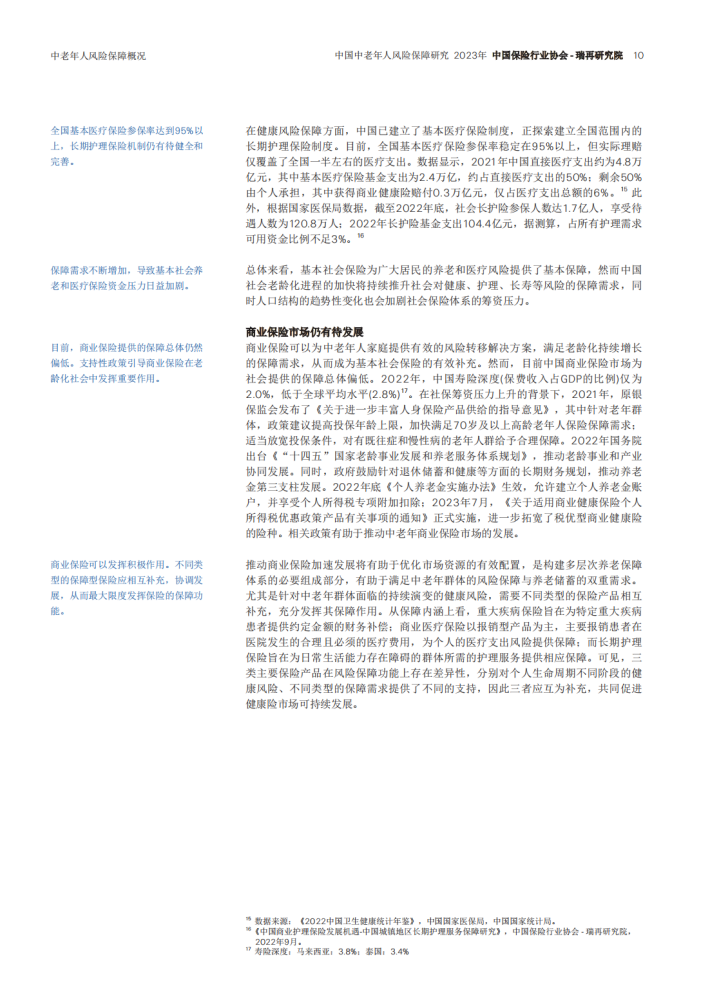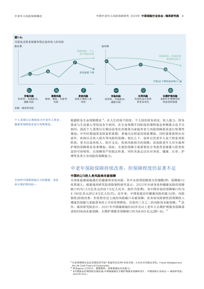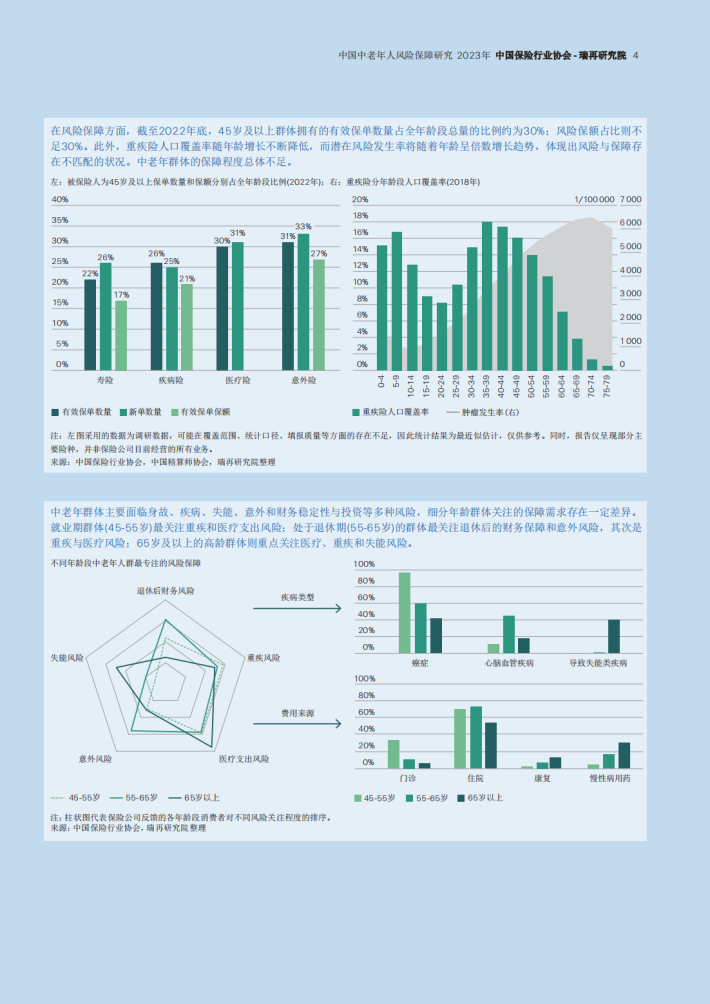 从财务生命周期视角来看,中老年群体所面临的各类人身风险及储蓄需求将随着生命阶段与就业状况的转变而持续变化。鉴于目前市场缺乏对中老年人商业保险的信息基础,本研究报告重点关注中国45周岁及以上被保险人的风险保障状况和市场需求,基于2023年中国保险行业协会对保险公司的调研结果,对商业人身险市场业务存量和新业务规模、产品类型、需求特征以及未来市场发展趋势进行了梳理和分析,旨在为政策制定者和市场参与者提供有价值的信息和参考,从而推动中老年商业保险市场发展。