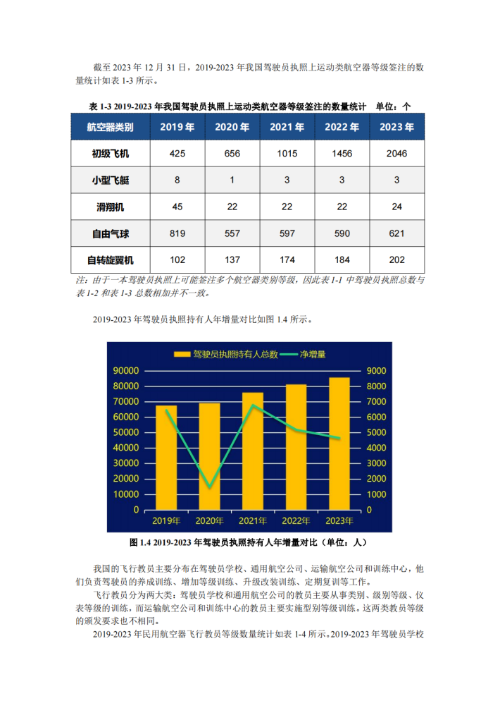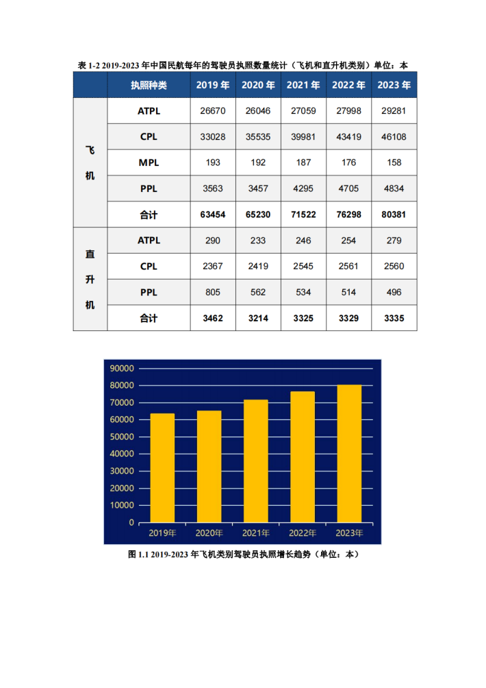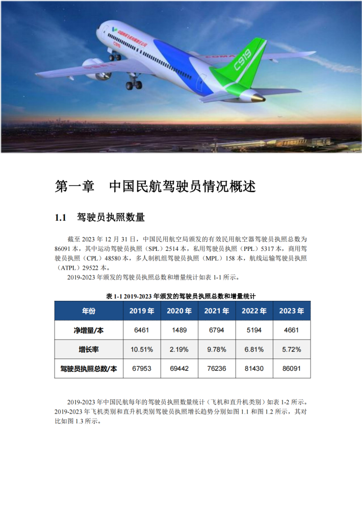 截至2023年12月31日,中国民用航空局颁发的有效民用航空器驾驶员执照总数为86091本,其中运动驾驶员执照(SPL)2514本,私用驾驶员执照(PPL)5317本,商用驾驶员执照(CPL)48580本,多人制机组驾驶员执照(MPL)158本,航线运输驾驶员执照(ATPL)29522本。