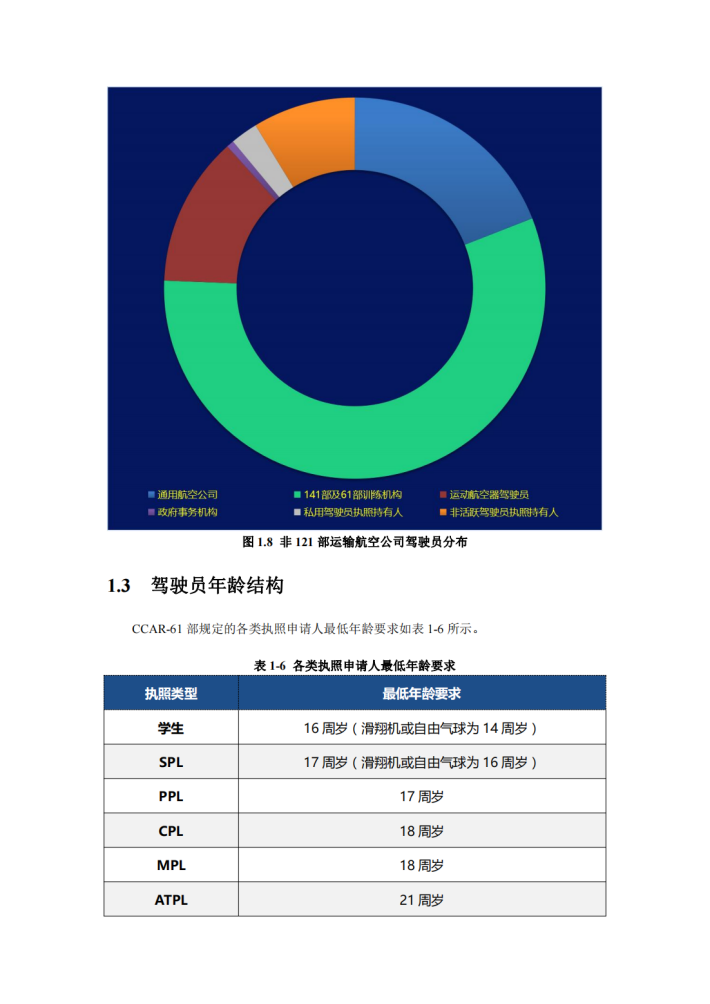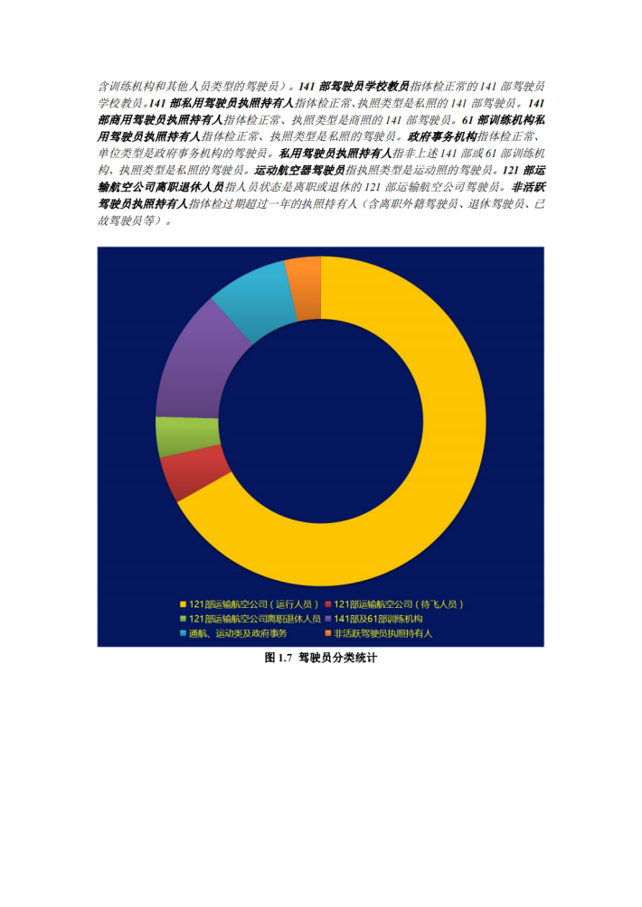 我国民航驾驶员主要分布在121部运输航空公司、通用航空公司(包括91部通用航空136部特殊商业和私用大型、135部小型商业运输和空中游览)、141部驾驶员学校【包括教员、私用驾驶员执照和商用驾驶员执照持有人】、体育运动机构、政府事务机构及其他领域,其中政府事务机构包括交通运输部救助打捞局、中国民用航空飞行校验中心等,私用驾驶员主要指持有私用驾驶员执照的人员。